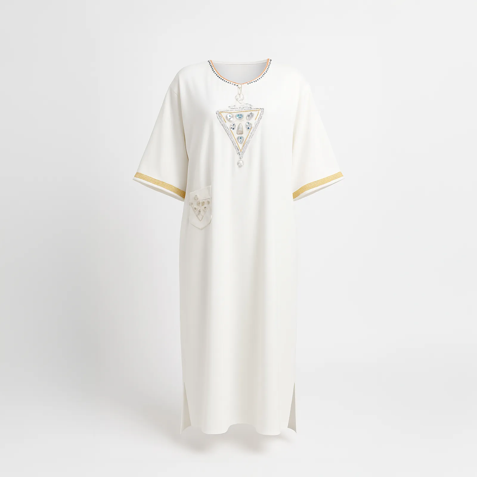 A white Amazigh caftan symbolizing purity, freedom, and ancestral pride. A minimalist yet profound garment, often worn for special ceremonies, representing both tradition and dignity.