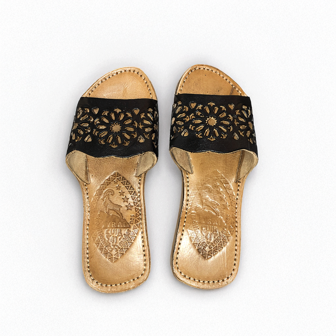 These black Moroccan leather sandals showcase a classic traditional pattern, expertly handcrafted for both style and comfort. Perfect for everyday wear or special occasions, they bring authentic Moroccan artistry to your wardrobe.