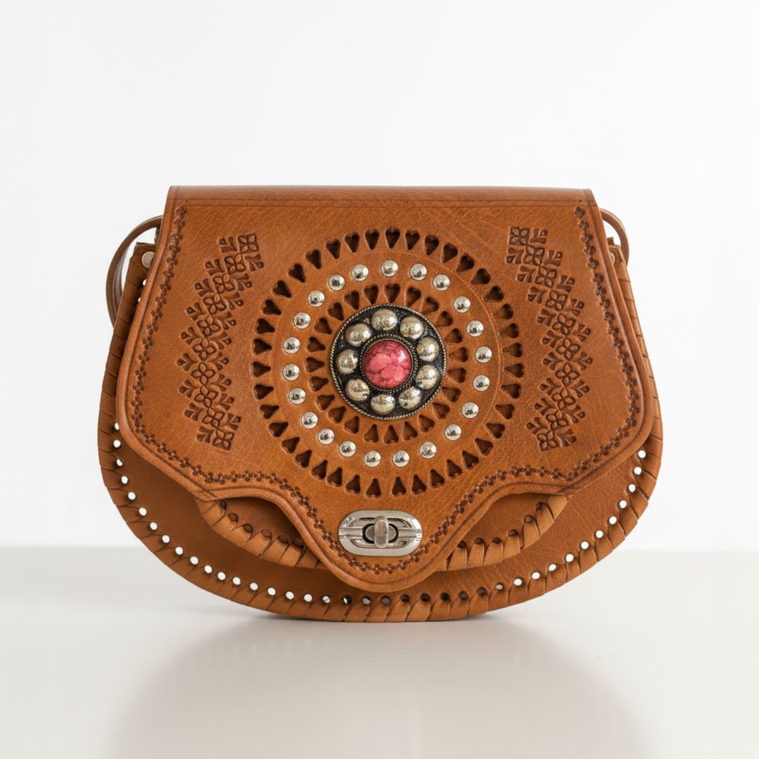 Featuring hand-embossed floral patterns inspired by Moroccan desert art, this purse tells a story in every detail. The sturdy leather softens beautifully over time, while the antique brass buckle adds a vintage charm that never goes out of style.