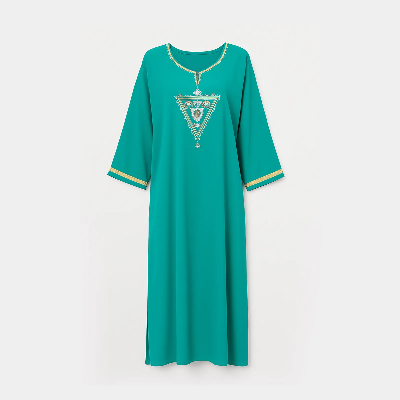 A lush green caftan channeling Morocco’s connection to nature and renewal. The color of growth and balance, it’s a garment that stands out while staying true to artisanal roots.